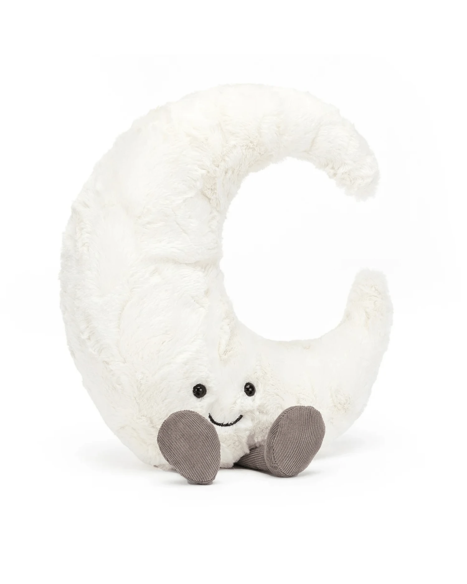 Gorgeously textured with velvety craters, Amuseable Moon is full of fun! A midnight matey for bedtime hugs, this pearly-white pal is curvy and cuddly. With squidgy cord booties, a weighted bottom and a peaceful smile, this moon’s waxing poetic! A magical crescent and a marvelous present.