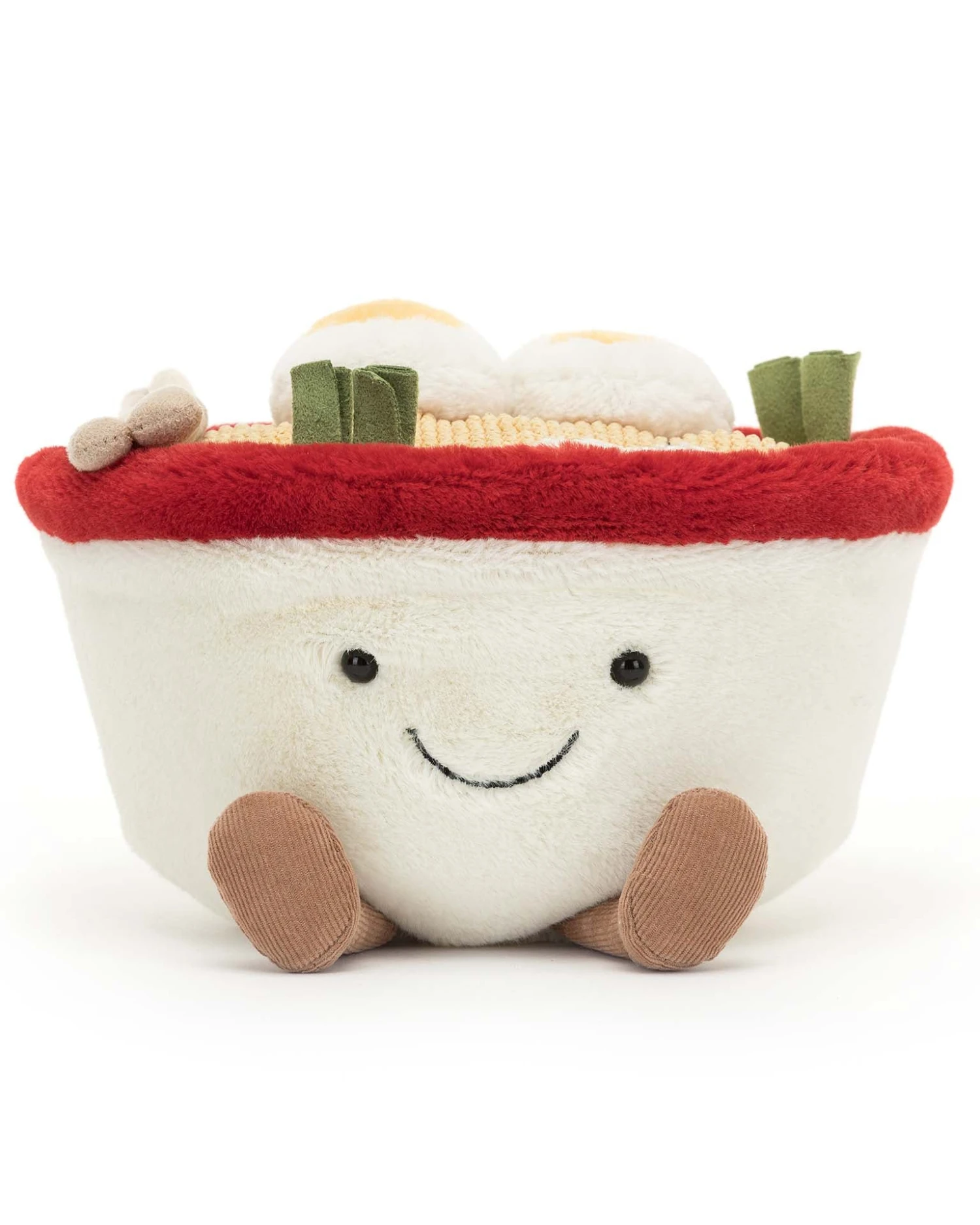 Amuseable Ramen is full of kawaii charm, from the cream-and-red bowl to the suedette chopsticks. Filled with wavy cord noodles, suedette spring onions and fluffy boiled eggs, as well as a pink embroidered fish cake, this dish is a wish come true.