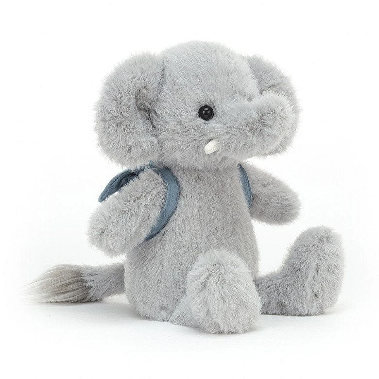 Backpack Elephant’s ready for the hike! This tusky, fuzzy grey pack-yderm hasn’t forgotten a single item, but needs to get a move on! With tufty tail, blue linen backpack and trunk raised quizzically, you can stomp out in style with this softy by your side!