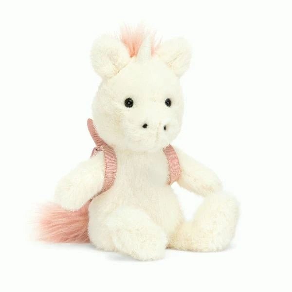 Backpack Unicorn is off on a quest! This brave little foal has tussle cream fur, a petal-pink mane and matching tail, and the sweetest suedey horn. Their unicorn backpack is fully lined and perfect for tiny supplies! With tufty ears, supersoft hooves and big bright eyes, this is one magical rambler!