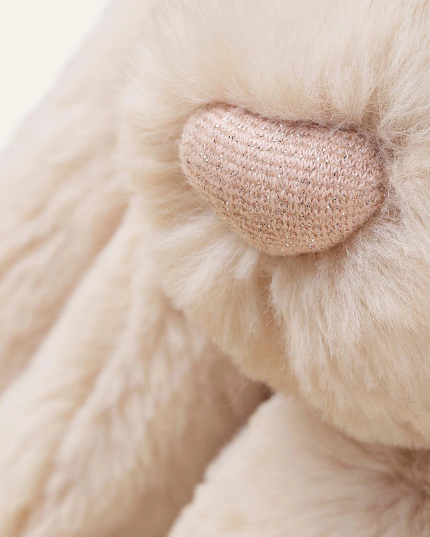The ultimate bunny companion, finished in a delicate golden hue. Each detail of the original Bashful Bunny has been refined to create the new Luxe Bunnies. Exceptional soft fur that feels light and luxurious. A beautiful tail formed from longer soft fur fabric creating a gorgeous plume-like pompom. A pretty nose featuring exquisite sparkling thread detail.