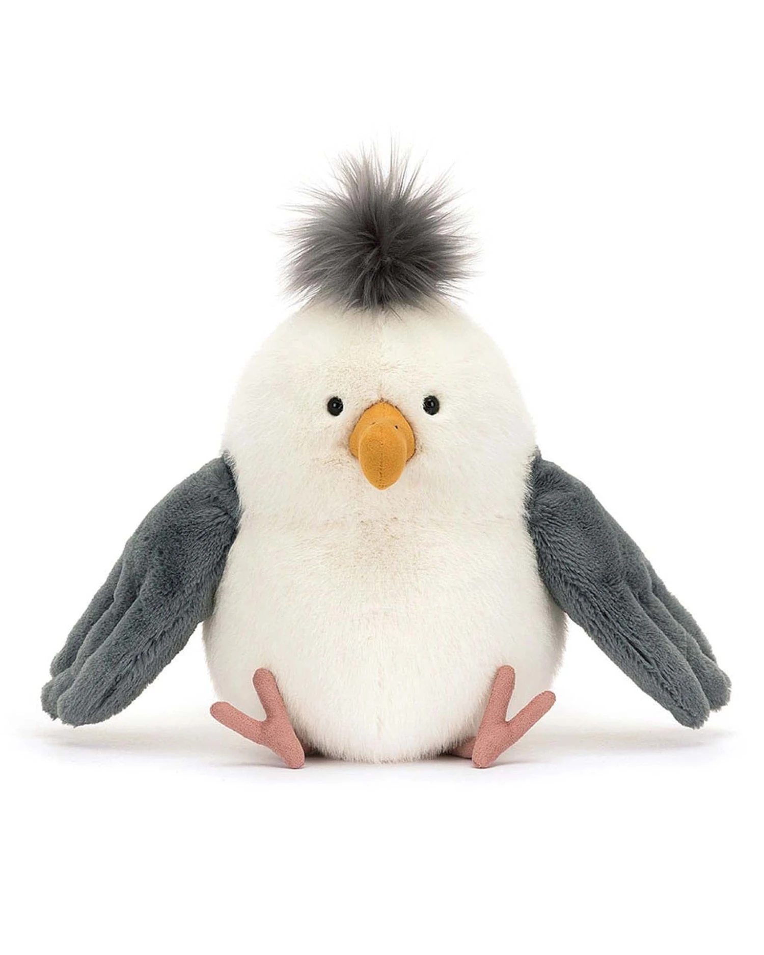 Chip Seagull is a top beach bird. In soft cream fur with dark grey wings, Chip has thin, suedette legs and a dark grey tuft. With a curved mustard suedette beak, Chip is ready for a beach picnic or two this summer!