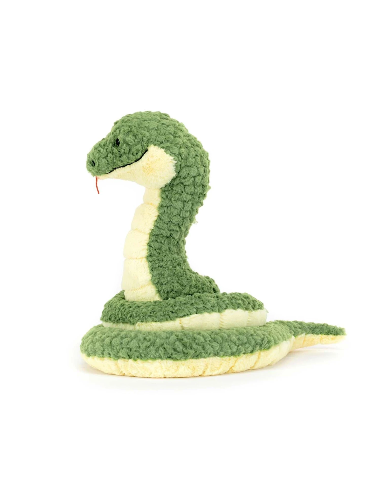 Cizi Snake is ready to celebrate! A bold snake in contrasting green and pale yellow fur, Cizi has textured scale detail, and is coiled but poised with that head held high, showcasing that suedette forked tongue.