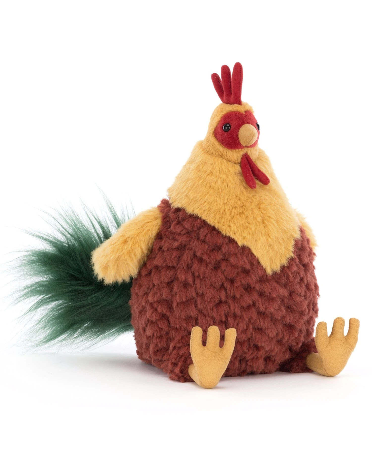 Proud and podgy, Cluny Cockerel is just like a big soft pineapple! This dizzy dandy has a tufty cocoa tum, custard bib and wings, and sunny suedey claws. Not to mention that fine scarlet wattle and comb, bold red eye mask and plumey green tail! A huggable hero!