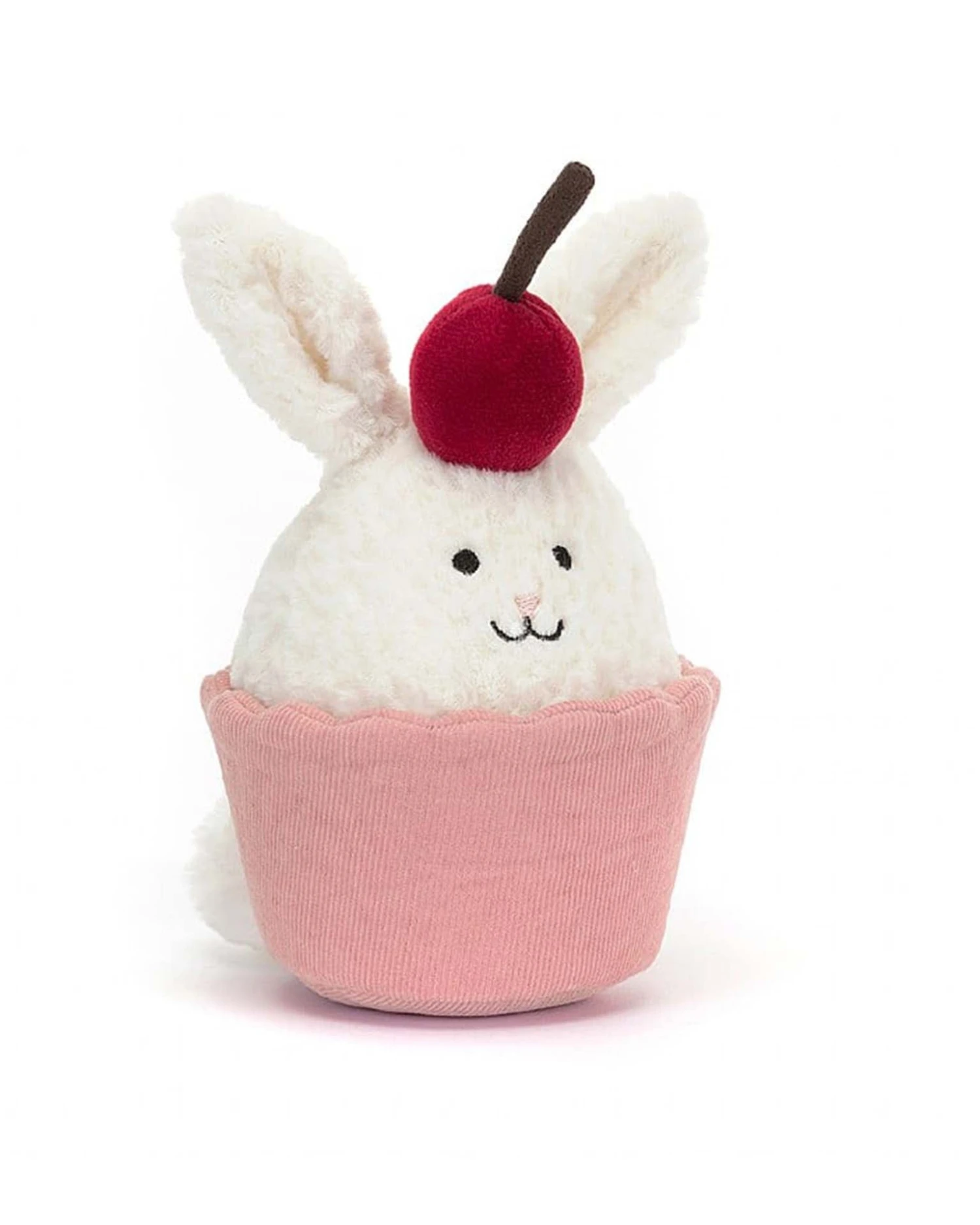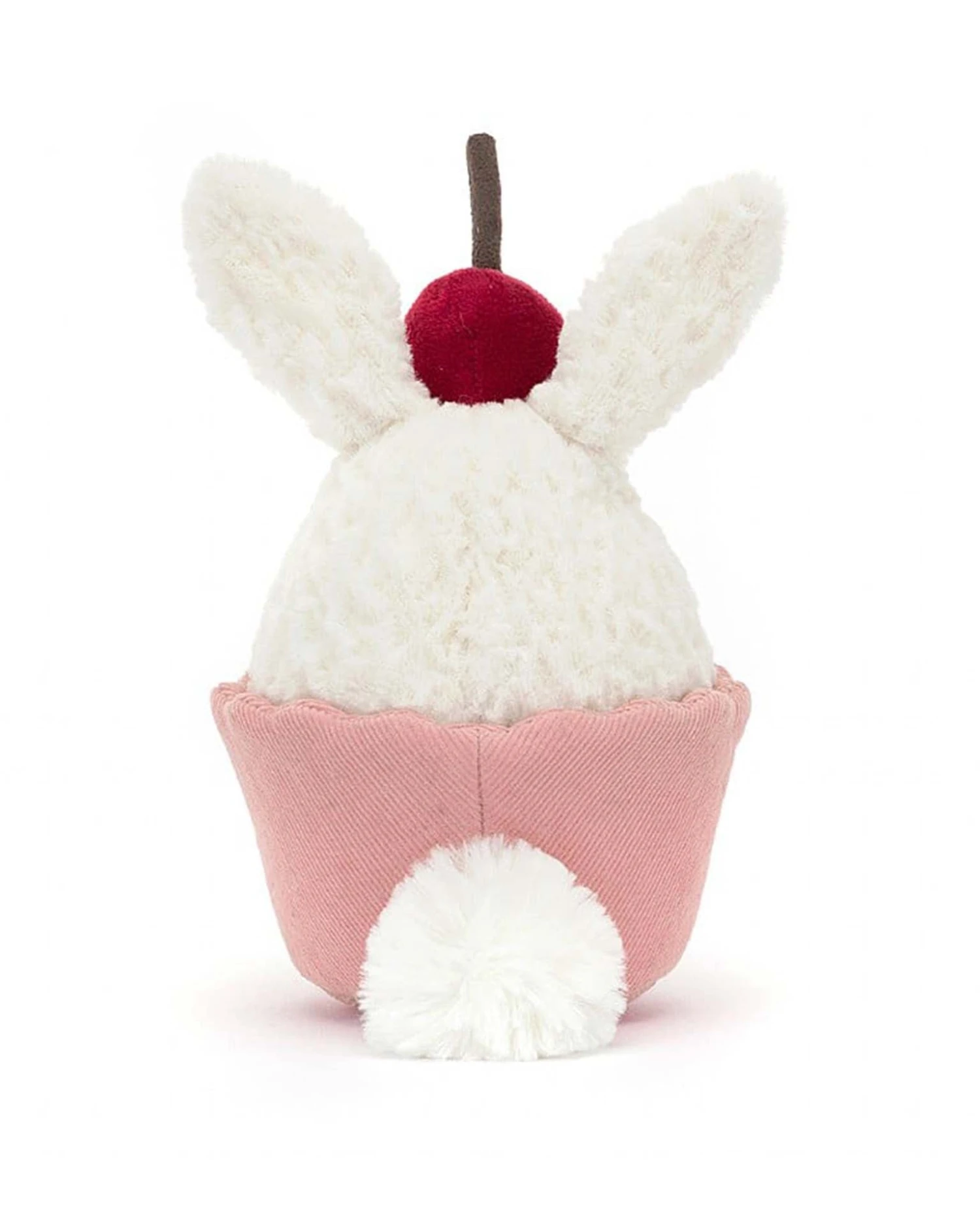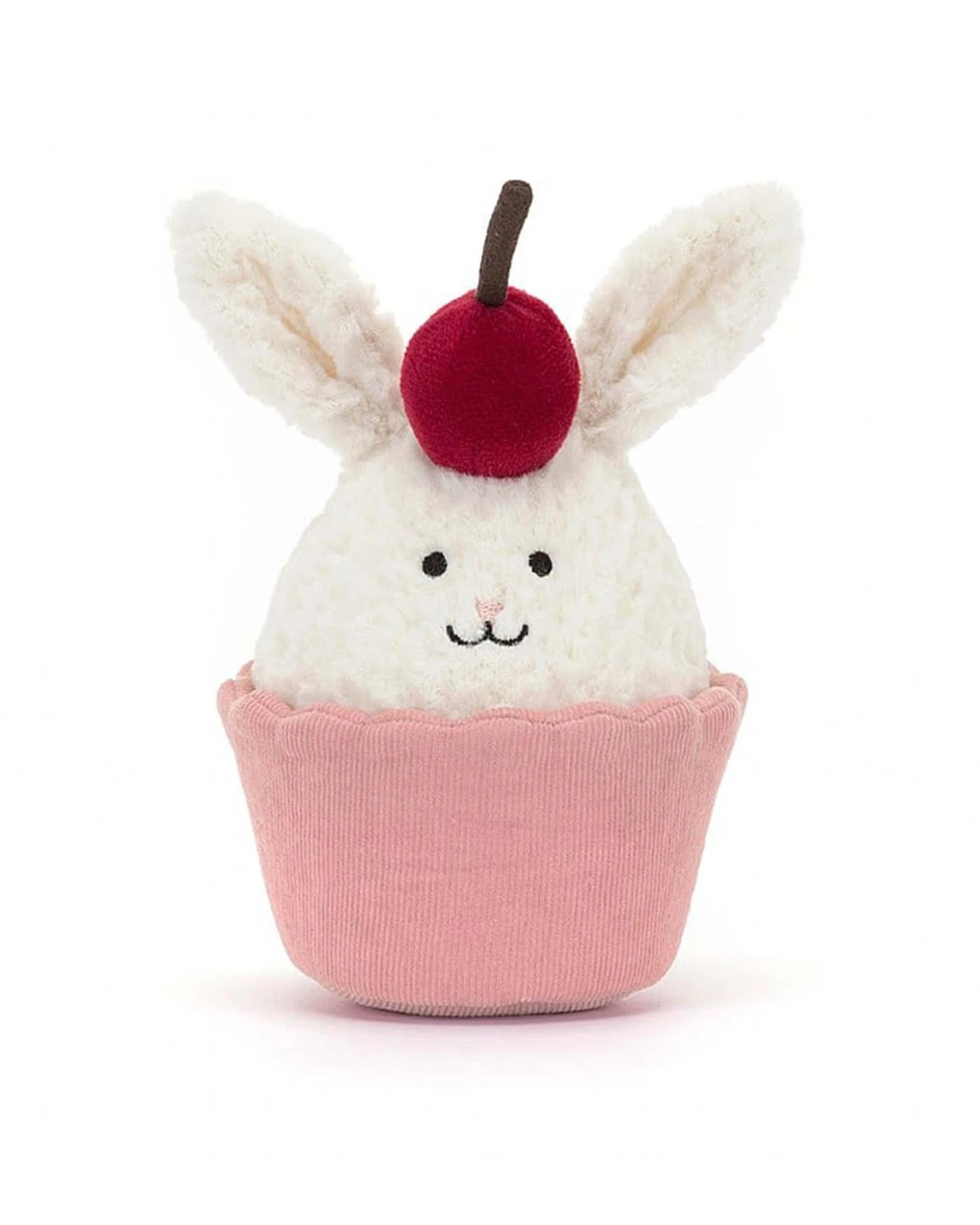 The Dainty Dessert Bunny Cupcake is gorgeously mixed-up. Inside that pink fine cord cake case there’s a soft cream bunny masquerading as a treat! This long-eared bunny has textured fur and wears a bold cherry hat. There’s even a bobtail peeping out! A cute gift with kawaii charm.