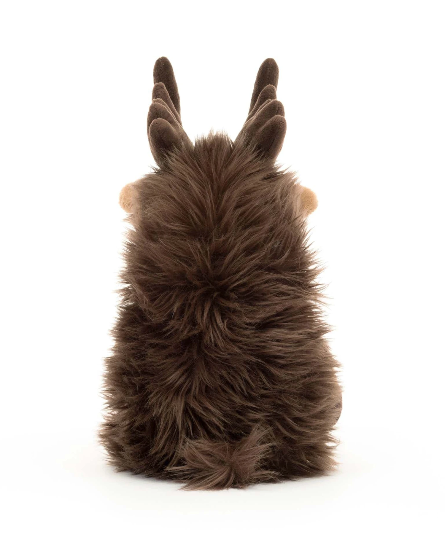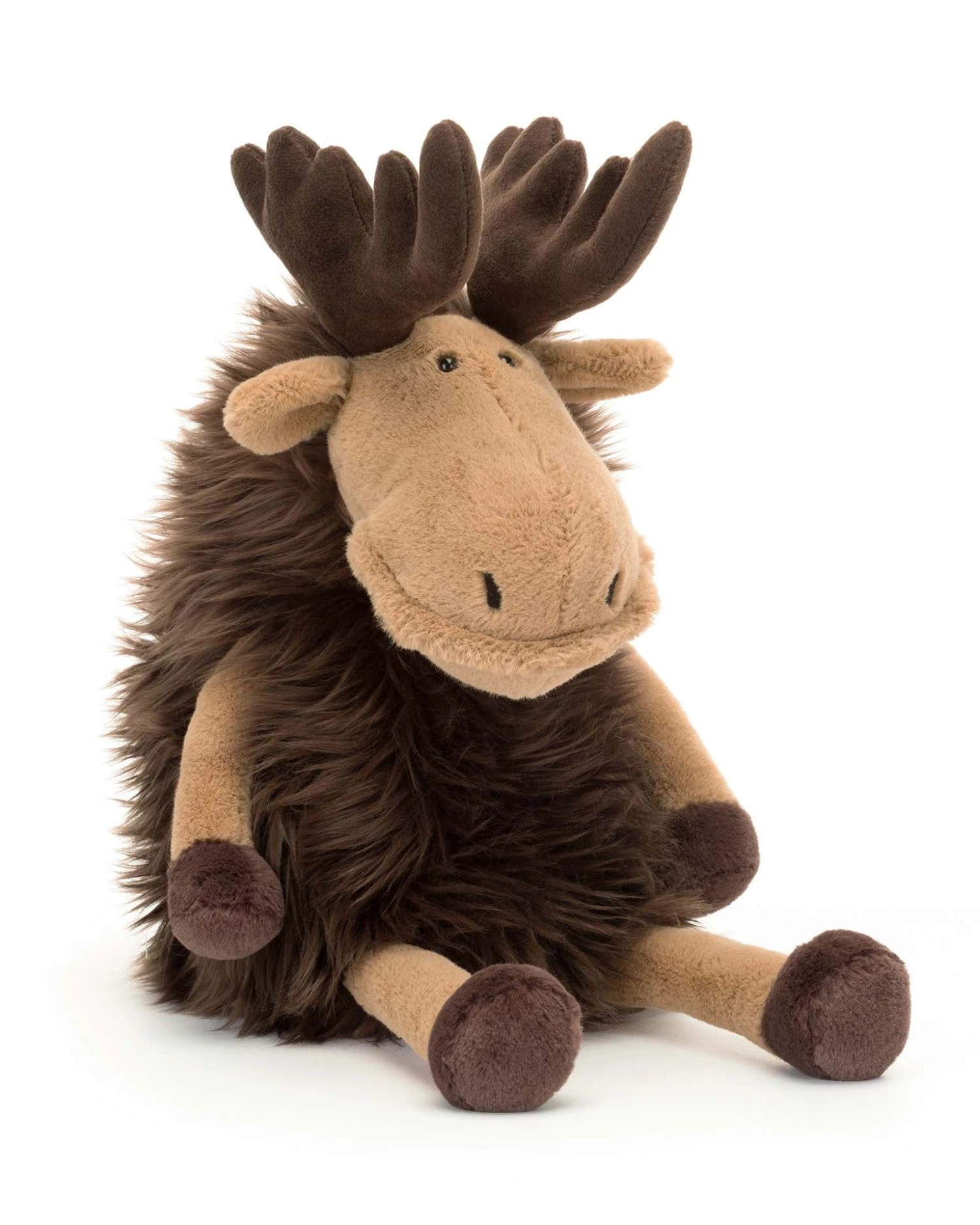Chunky, quirky and dreamy to hug, Merrick Moose is nosing ahead! This gorgeous moose has a huge almond muzzle with a textured lip and stitch-detail face. A gentle giant with caramel limbs, Merrick has mighty cocoa antlers, soft, shaggy fur and beany hooves. A stunning gift for wildlife fans.