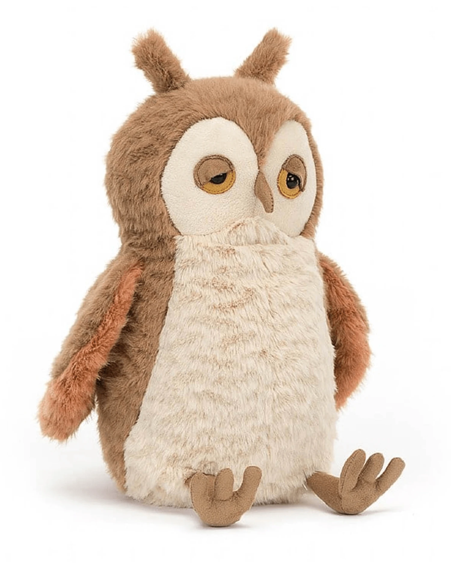 My my, is that the time? Oakley Owl is bonny and yawny with divinely droopy suedey eyelids. A bumbly bundle of chocolate and nougat, with peach underwings and rumples all over, this tufty-top owl waggles both bobble feet and slowly begins to wake up.