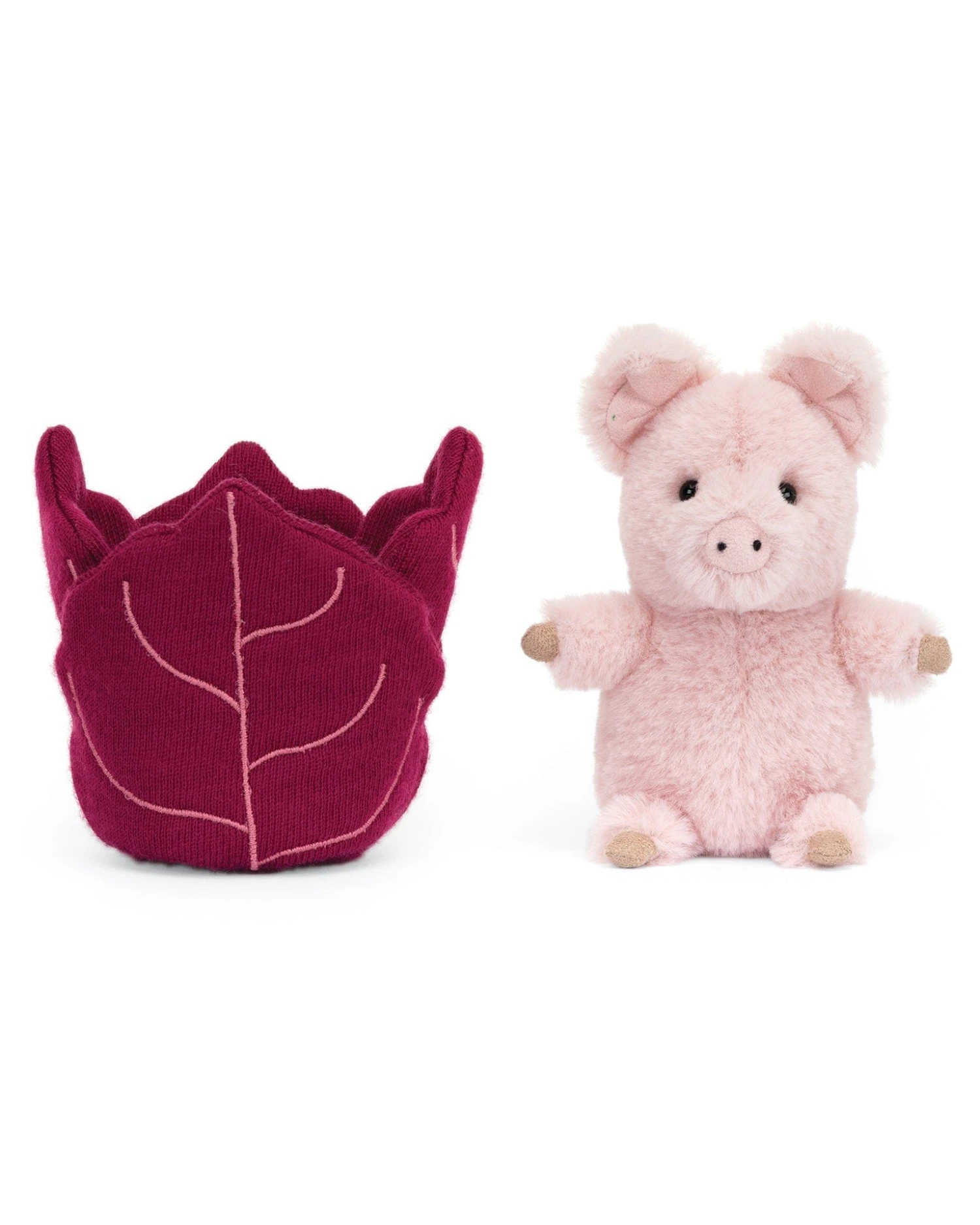 Poppin Pig has a nose for tasty grub! You can let this blush-pink piggy snout around in your hand or pocket, or keep them in a cup of rosy jersey cabbage leaves. Either way, remember to give those rumpled, suedey ears a good rub!